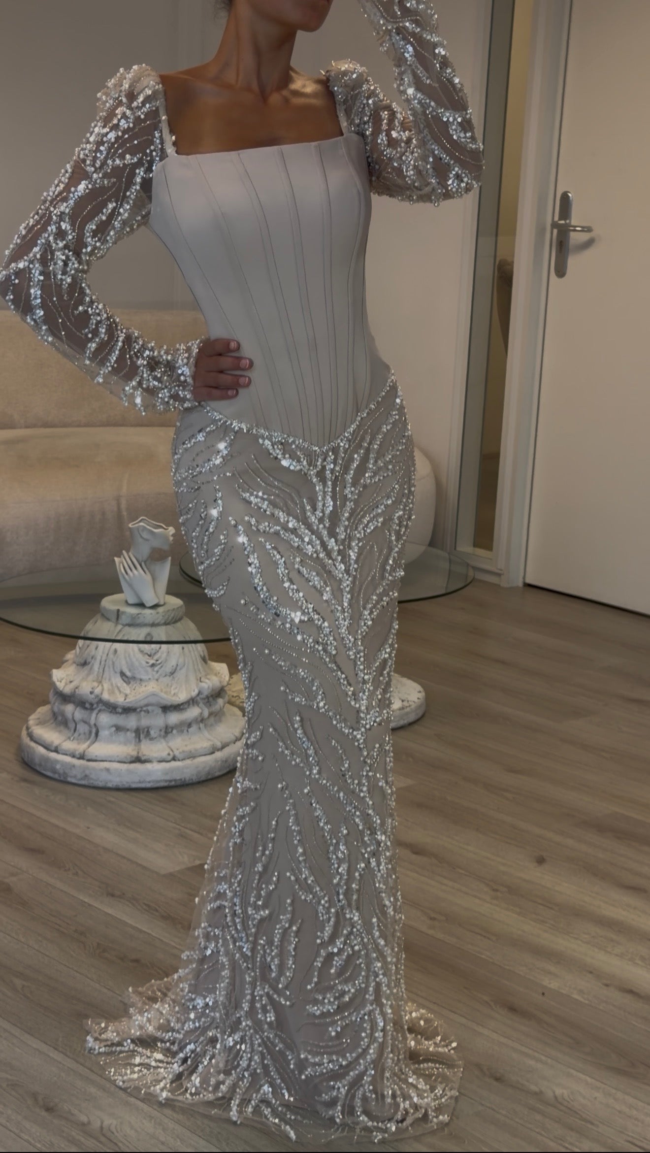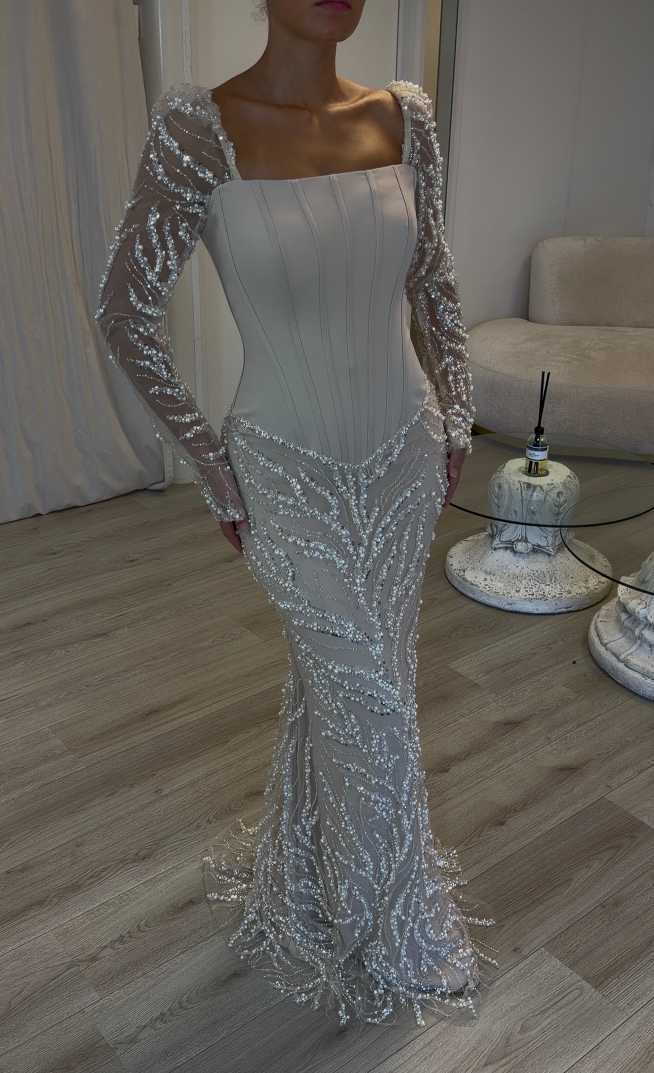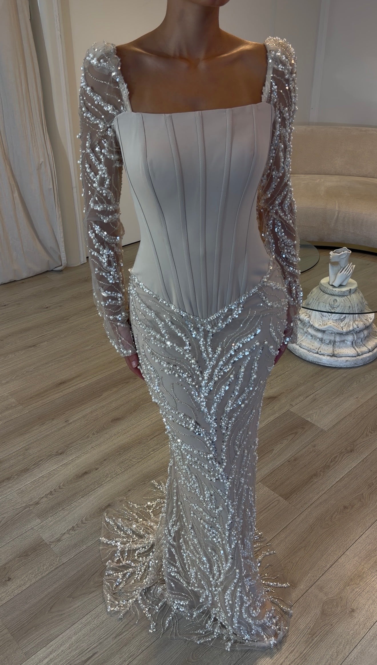 The bodice is structured with boning for support and shape. Due to the natural flexibility of the boning, slight bending or curvature may appear after wearing. This is likely to occur during normal use and is a common characteristic of this type of construction. It does not affect the quality or wearability of the dress.