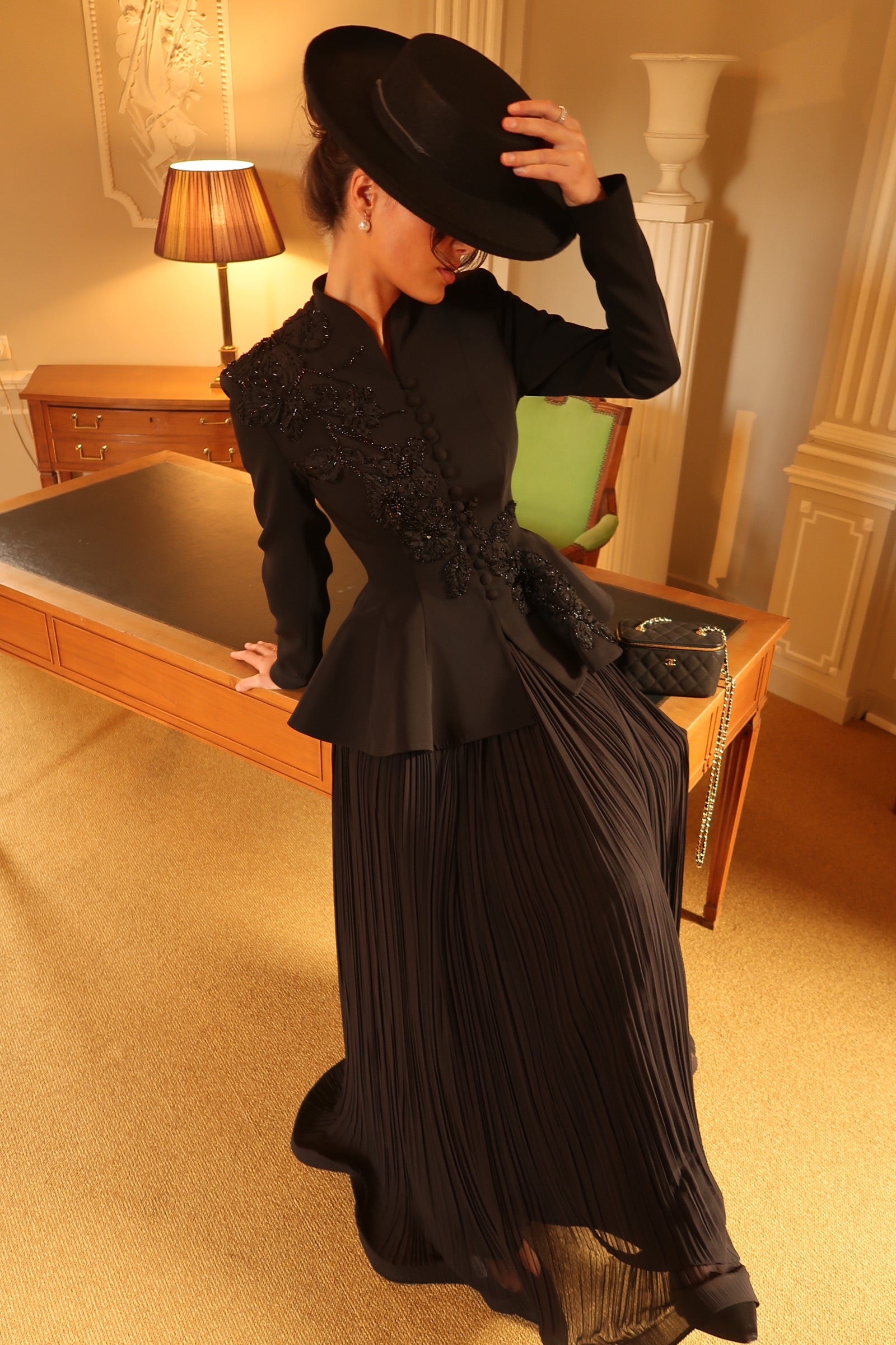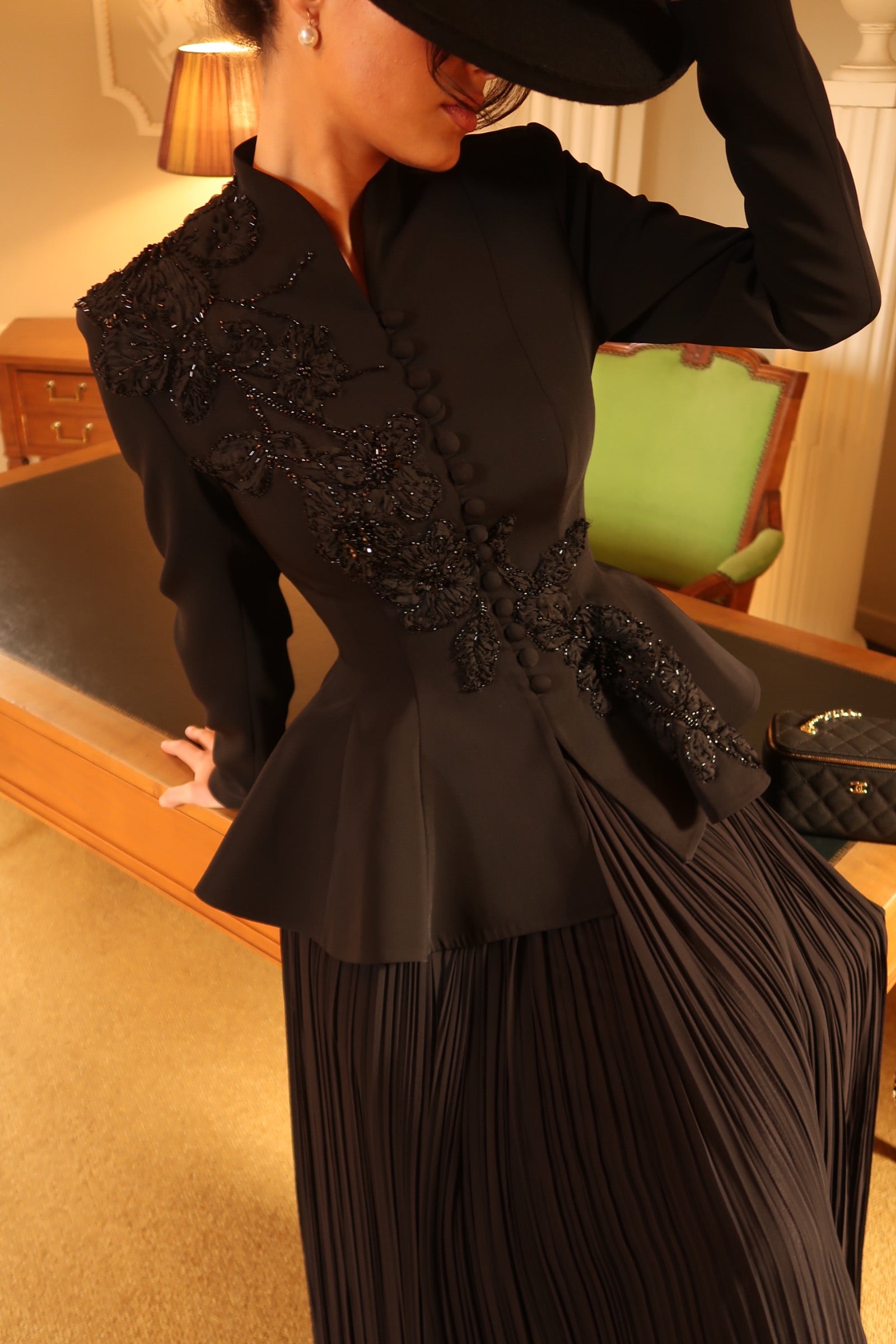 A flowing pleated skirt pairs effortlessly with a corset-inspired blazer, designed to sculpt a feminine silhouette with front buttons and hand-embroidered bead detailing.