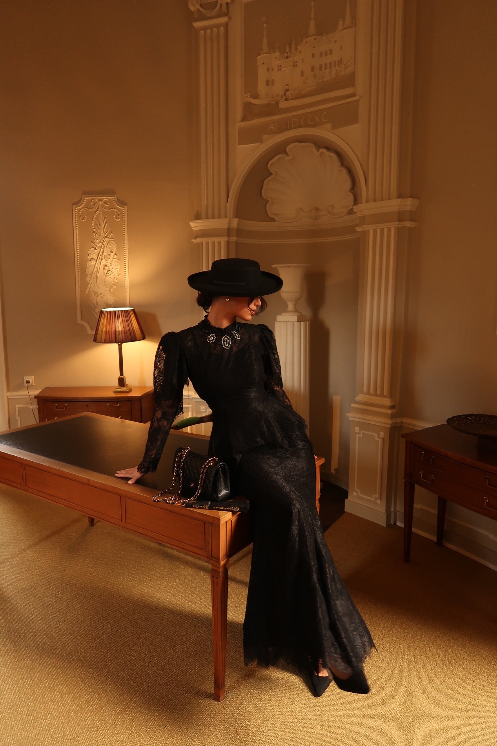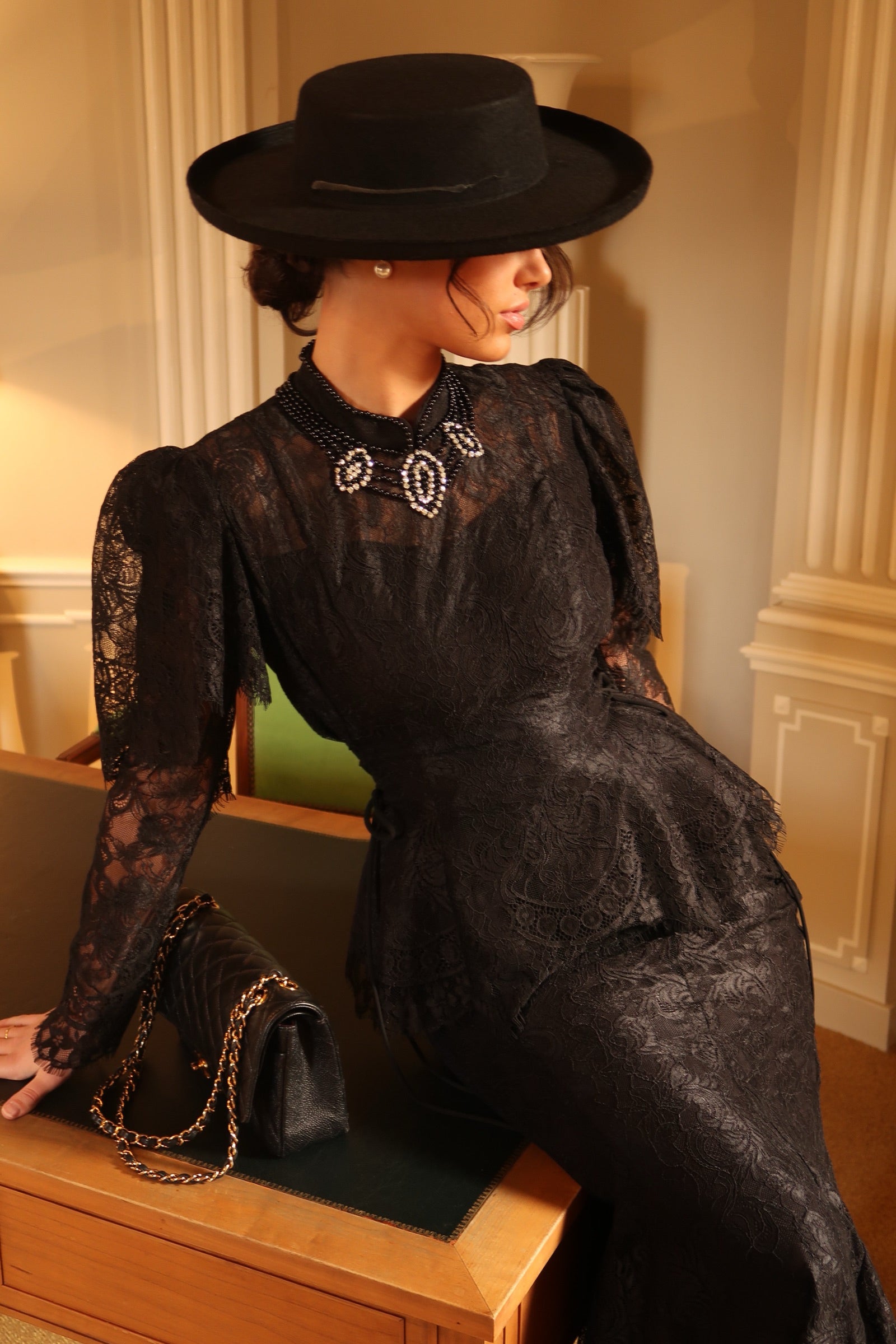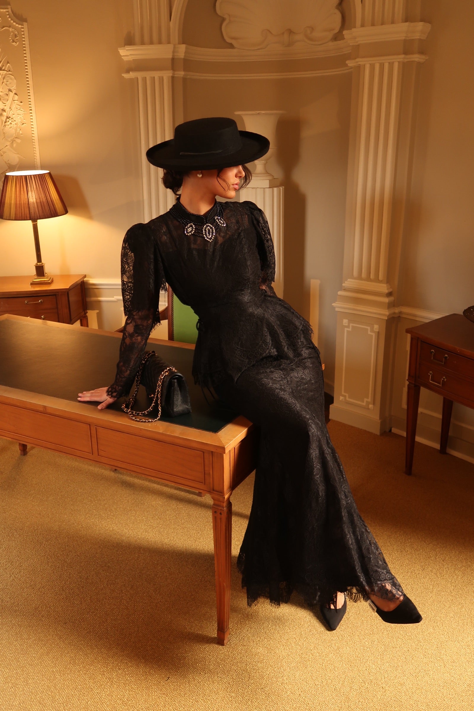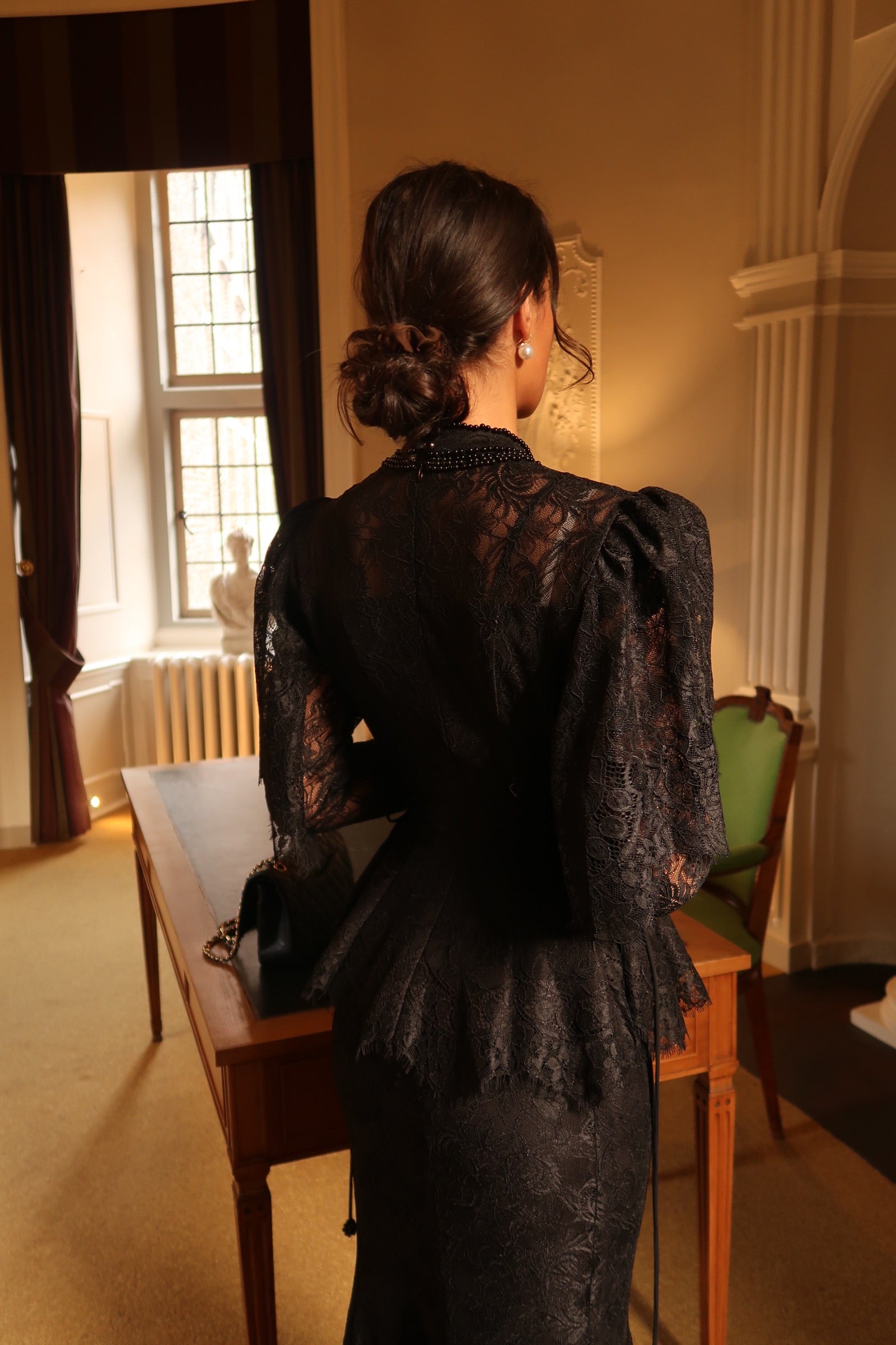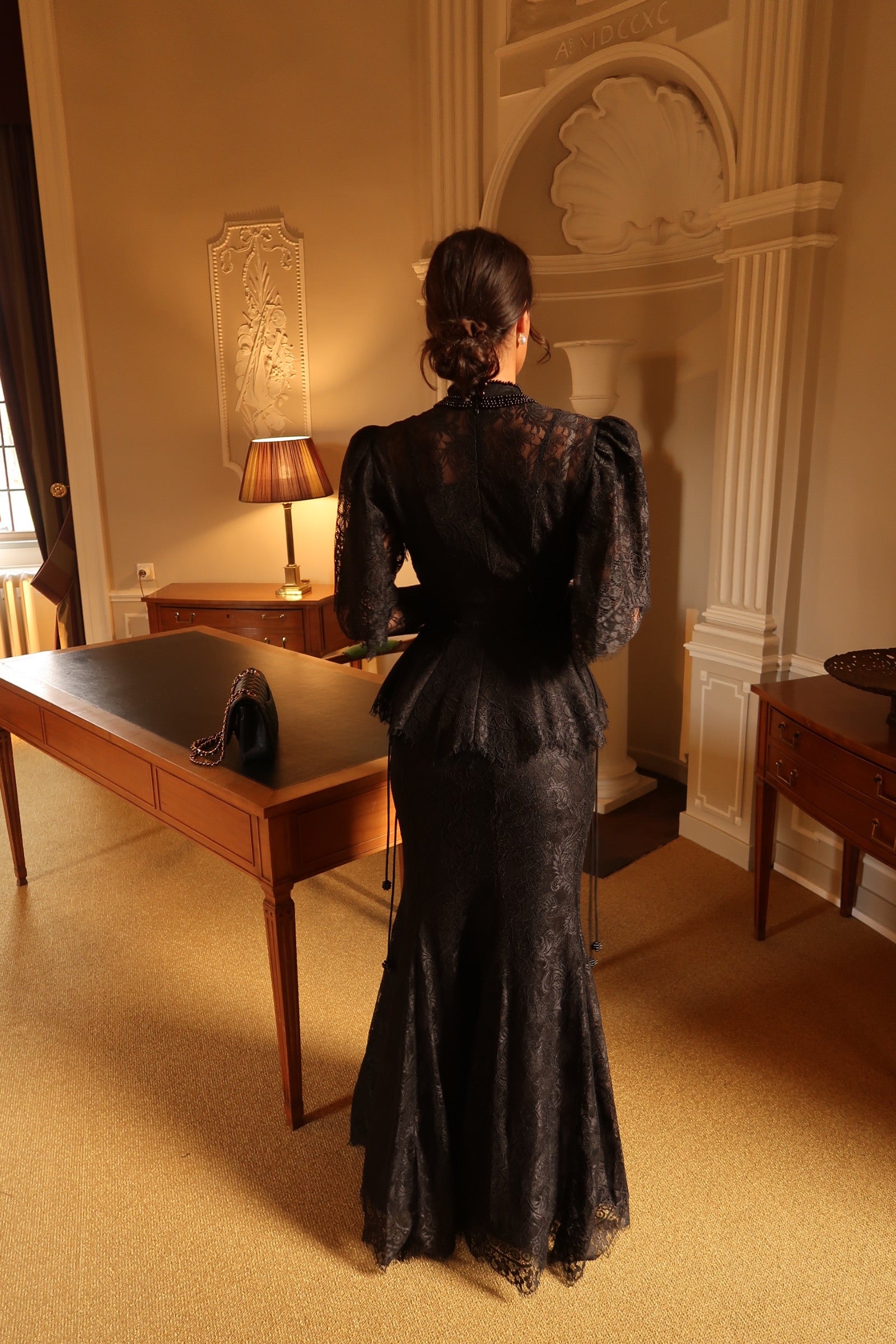 The Evelina Set is the epitome of timeless sophistication. Crafted from delicate black lace, this two-piece ensemble features a sculpted peplum top with refined sleeve detailing and a sleek floor-length skirt that drapes with effortless grace.